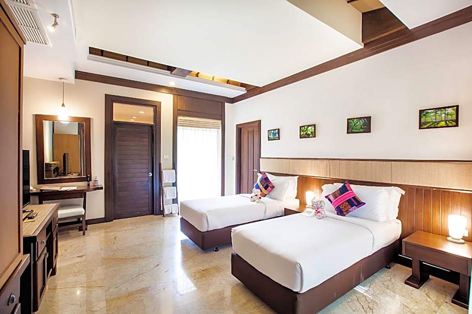 Spacious villa offers a separate living room with a dining area. There is also a private terrace with an outdoor daybed.
